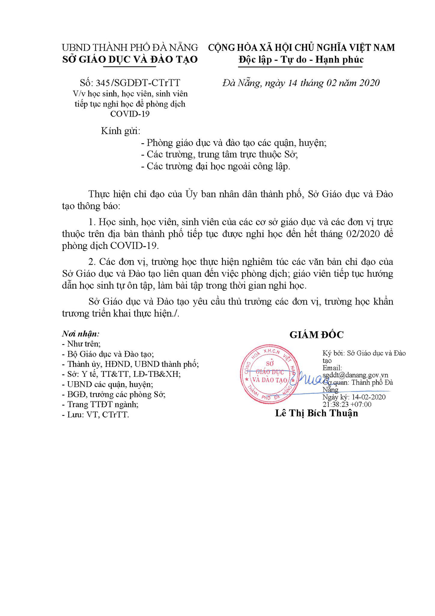 Thực hiện Công văn chỉ đạo của Sở GD&ĐT thành phố Đà Nẵng số 345/ SGDĐT-CTrTT ngày 14/2/2020 về việc học sinh, sinh viên tiếp tục nghỉ học để phòng dịch COVID-19, Trung tâm Anh ngữ ACADEMY AEC xin thông báo kéo dài thời gian nghỉ học của học viên AEC đến hết tháng 2/2020.