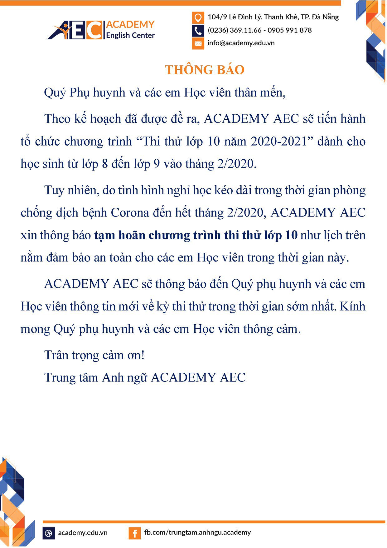 Trước tình hình nghỉ học kéo dài trong thời gian phòng chống dịch bệnh Corona dự kiến đến hết tháng 2, ACADEMY AEC xin thông báo tạm hoãn chương trình thi thử lớp 10 theo kế hoạch đã đưa ra (thứ Sáu, ngày 14/02) nhằm bảo đảm an toàn cho các em Học viên trong thời gian này.