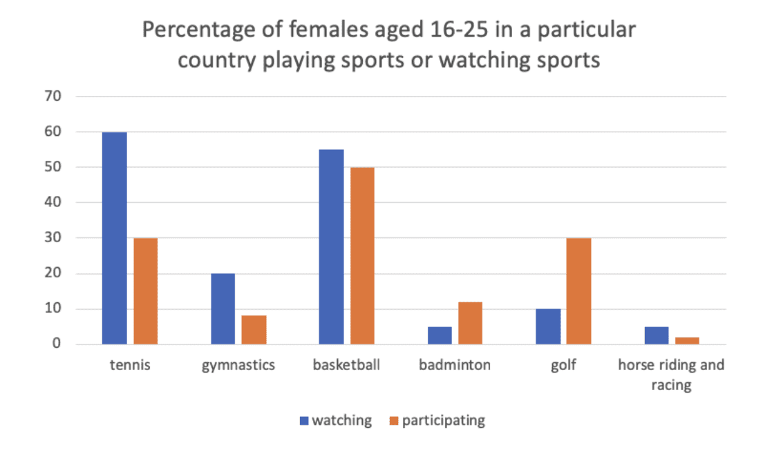 - TASK 1: The chart below shows the percentage of females aged 16-25 in a particular country who participated in sports, compared with the percentage of people who watched them in 2000.