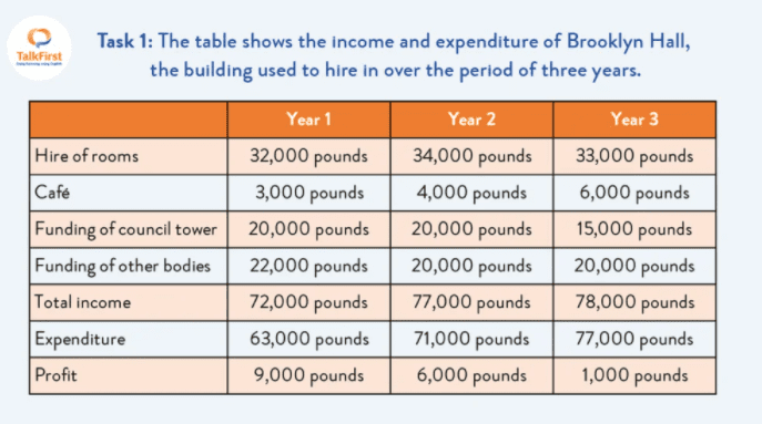 - TASK 1: The table shows the income and expenditure of Brooklyn Hall, the building used to hire in over the period of three years.