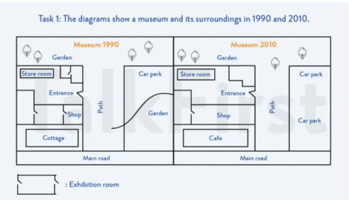 - TASK 1: The maps show the changes made to a small museum and its surroundings in 1990 and 2010.