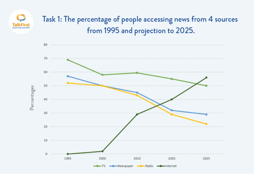 - TASK 1: Line graph (The percentage of people accessing news from 4 sources: TV, Radio, Newspaper, Internet)