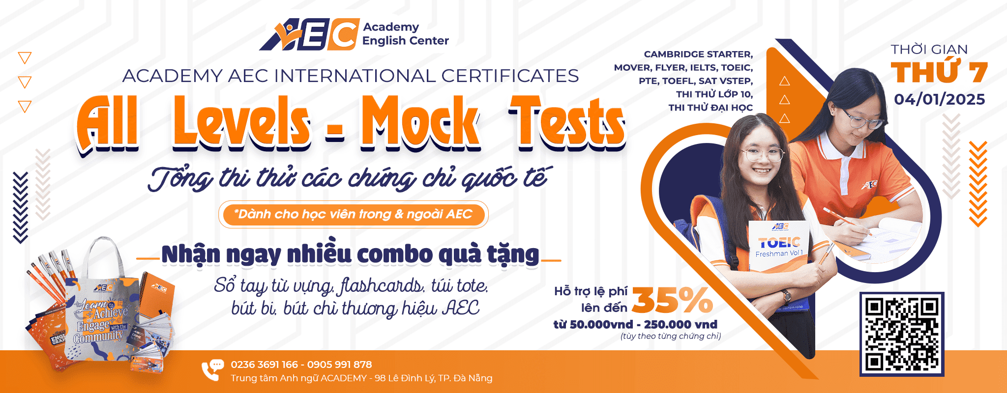 Tháng 1/2025, ACADEMY AEC tổ chức chương trình “AEC INTERNATIONAL CERTIFICATES – ALL LEVELS – MOCK TESTS – JAN 2025”, là cơ hội cho các Học viên muốn thử sức chinh phục các chứng chỉ trong nước & quốc tế, gồm: Cambridge Starter, Mover, KET, PET, IELTS, TOEIC, TOEFL, VSTEP.