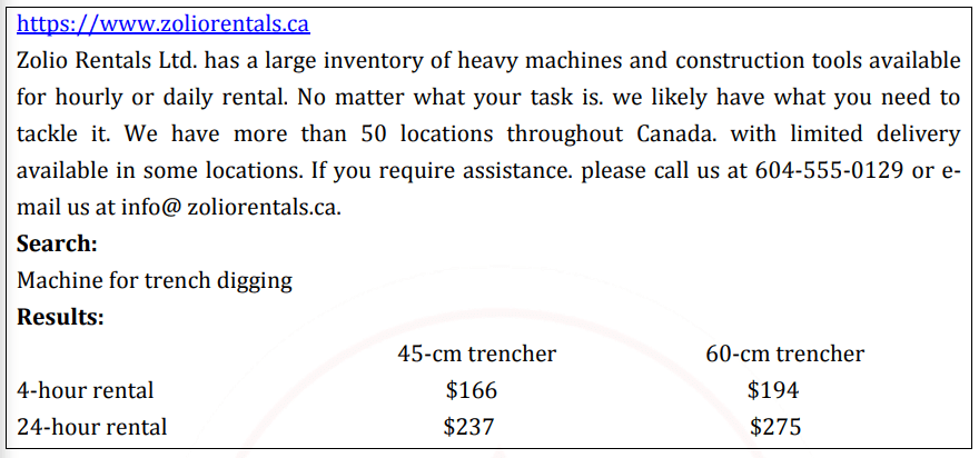 You had mentioned the other day that you anticipate needing to dig an litigation trench on your property, just as I do. I wanted to let you know that I did some searching on the Zolio Rentals Web site, and I have decided that tomorrow I am going to rent the smallest trencher that is available. I will need the machine only for a couple of hours, but since the closest rental location is 45 minutes away in Durham, and it will take time to load it onto my truck both for the trip home and back to Durham again. 1 have decided to rent the machine for a full day.