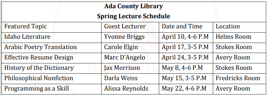 presented by a lecturer who will make her first visit to Ada County Library.